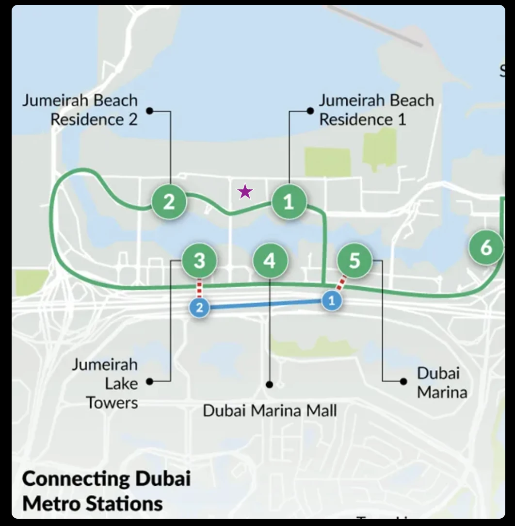 Routes 8 and 84 stop near the Bahar towers (JBR), a short walk from the venue.